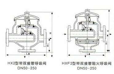 HXF2带双接管呼吸阀根据国家标准《石油化工企业设计防火规范》(GB50160-92)之规定:甲、乙类液体的固定顶罐,应设阻火器和呼吸阀。可见呼吸阀、阻火器是储罐不可缺少的安全设施。它不仅能维持储罐气压平衡,确保储罐在超压或真空时免遭破坏,且能减少罐内介质的挥发和损耗。上海吉林正阳移动健康管理有限公司厂生产的呼吸阀,具有结构紧凑、通气量大、泄漏量小、密封性能好等特点。